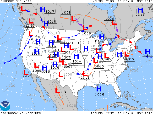 I had the opportunity to make an in-depth study of the weather in the Southeast yesterday in preparation for a flight in a small aircraft. The latest “Surface Analysis” provided by www.aviationweather.gov showed a fascinating mix of both high and low pressure systems and warm and cold fronts scattered about the country.