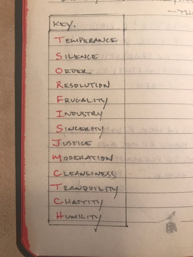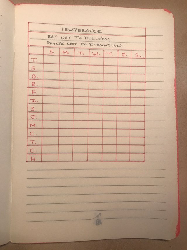 Yesterday I promised myself that I would prepare an exercise book in the manner described by Benjamin Franklin. He conceived this as a means of developing in himself the habitude of virtue.